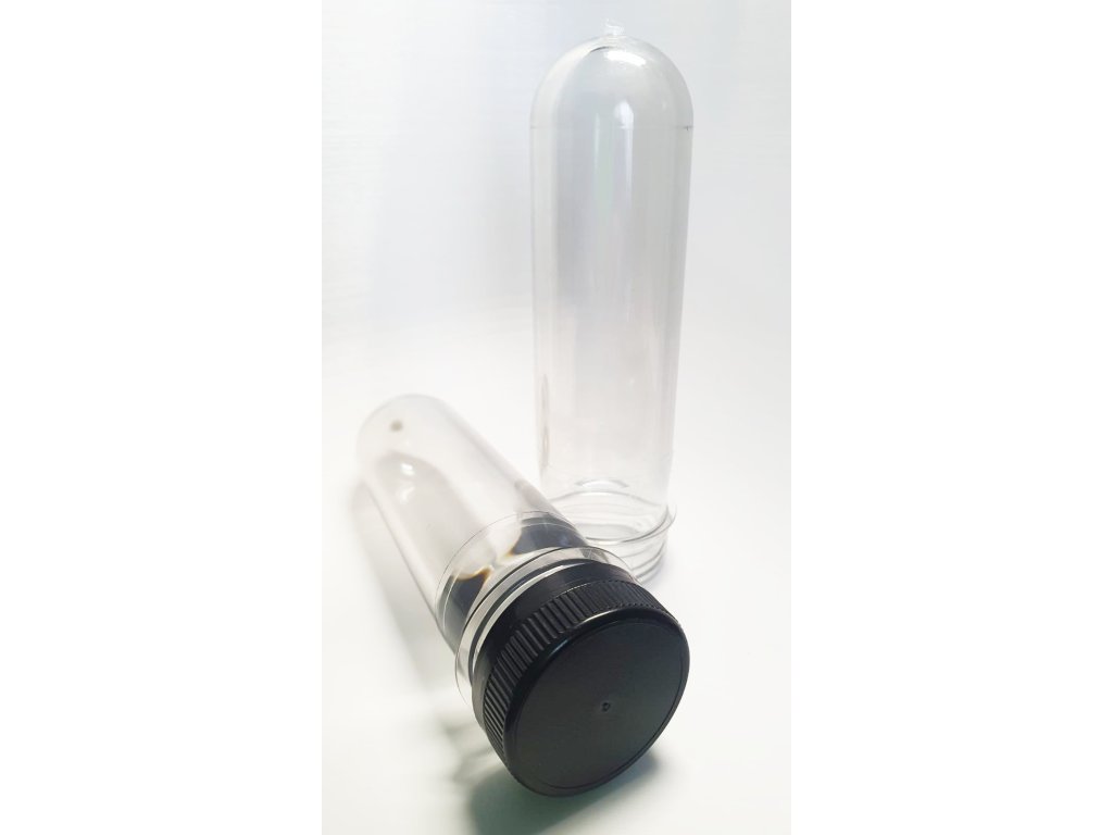 Sada 100 ks čirých preforem používaných pro výrobu PET láhví a kanystrů (mléko, džusy, ice tea). Včetně 100 ks černých uzávěrů.
